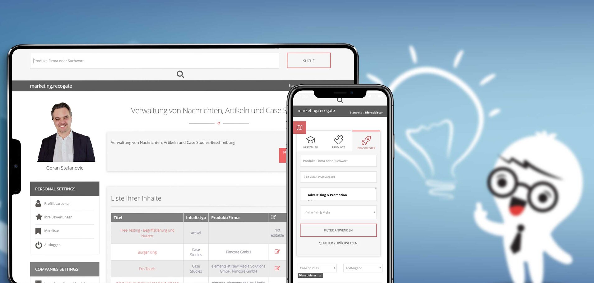 The aim of recogate was to create a new networked B2B marketplace for the marketing and IT industry that connects users, products, and service providers in the field of marketing solutions on a common platform.