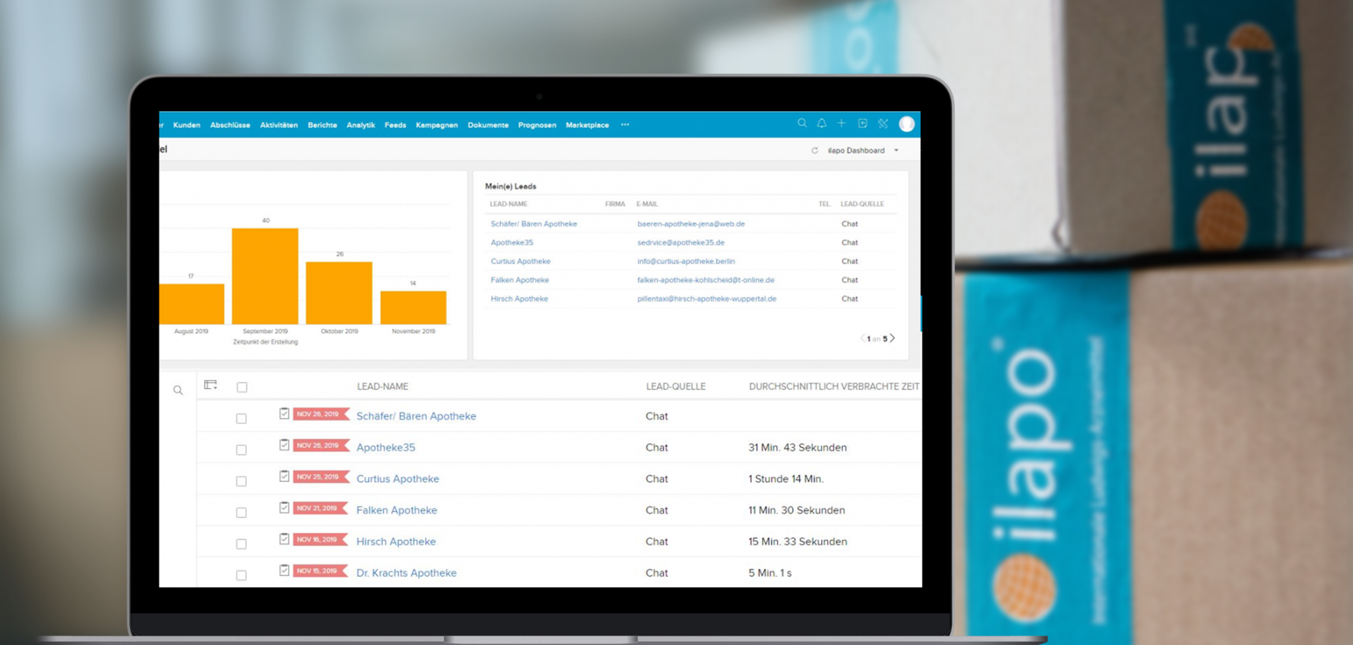 Ilapo is a pharmaceutical wholesaler for the import and export of medicines sourced from over 30 countries. The customers and suppliers are international and have not yet been managed centrally (together with leads). Ilapo would like to improve its digital orientation and therefore offer customers the opportunity to contact customer service directly on the website, in addition to contact by phone or email. Active contact from the CRM is also desired. The chat in the German-language area should only be available to customers who have problems with orders. In the English-language area of the website, the chat should be available everywhere in order to generate new leads.