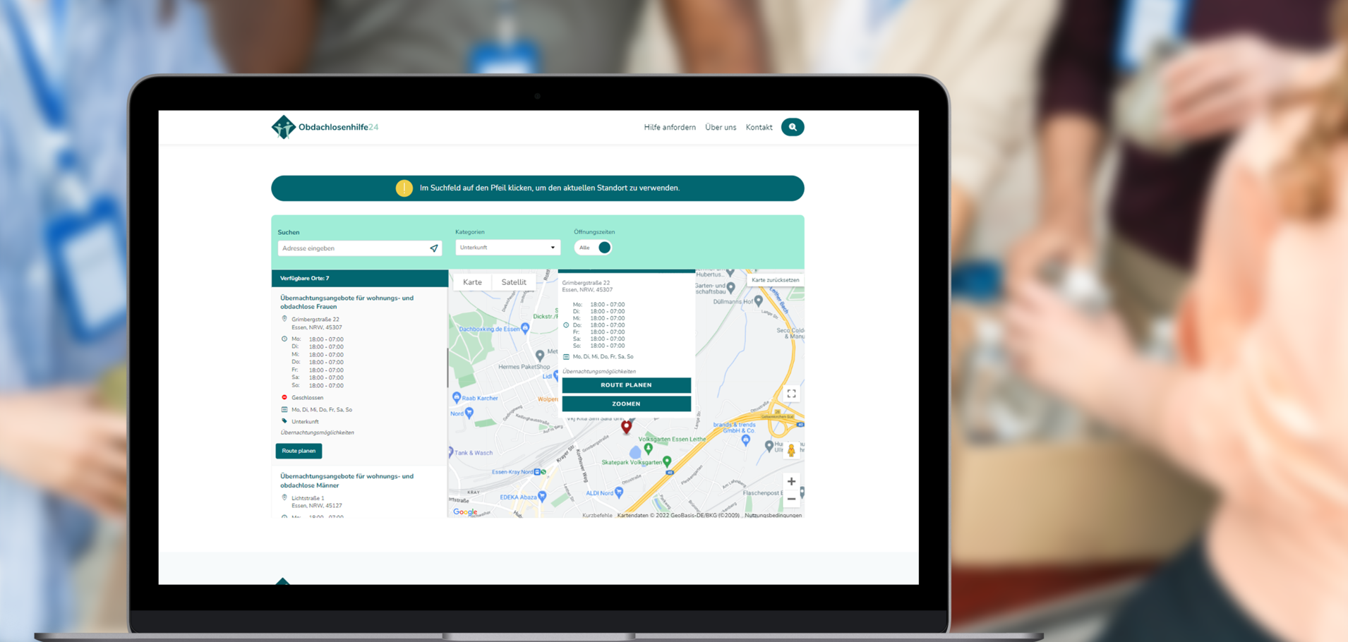 The Obdachlosenhilfe24 project lacked a central website with offers of help for the needy and homeless. The website needed to present all services, such as accommodation, medical care, food, clothing, etc. clearly and simply. Optimized mobile usability is also important, as many homeless people access the website via smartphones.